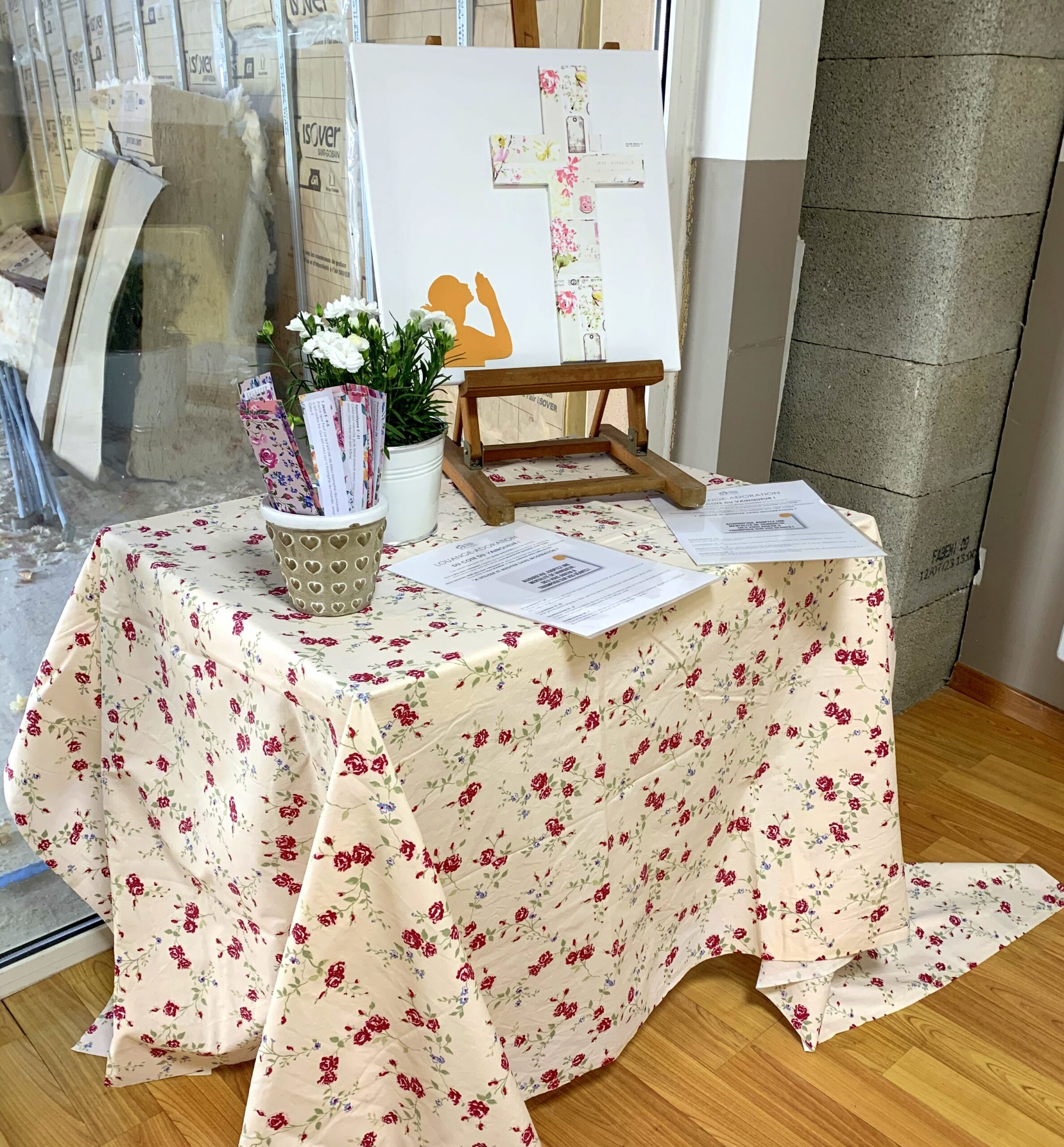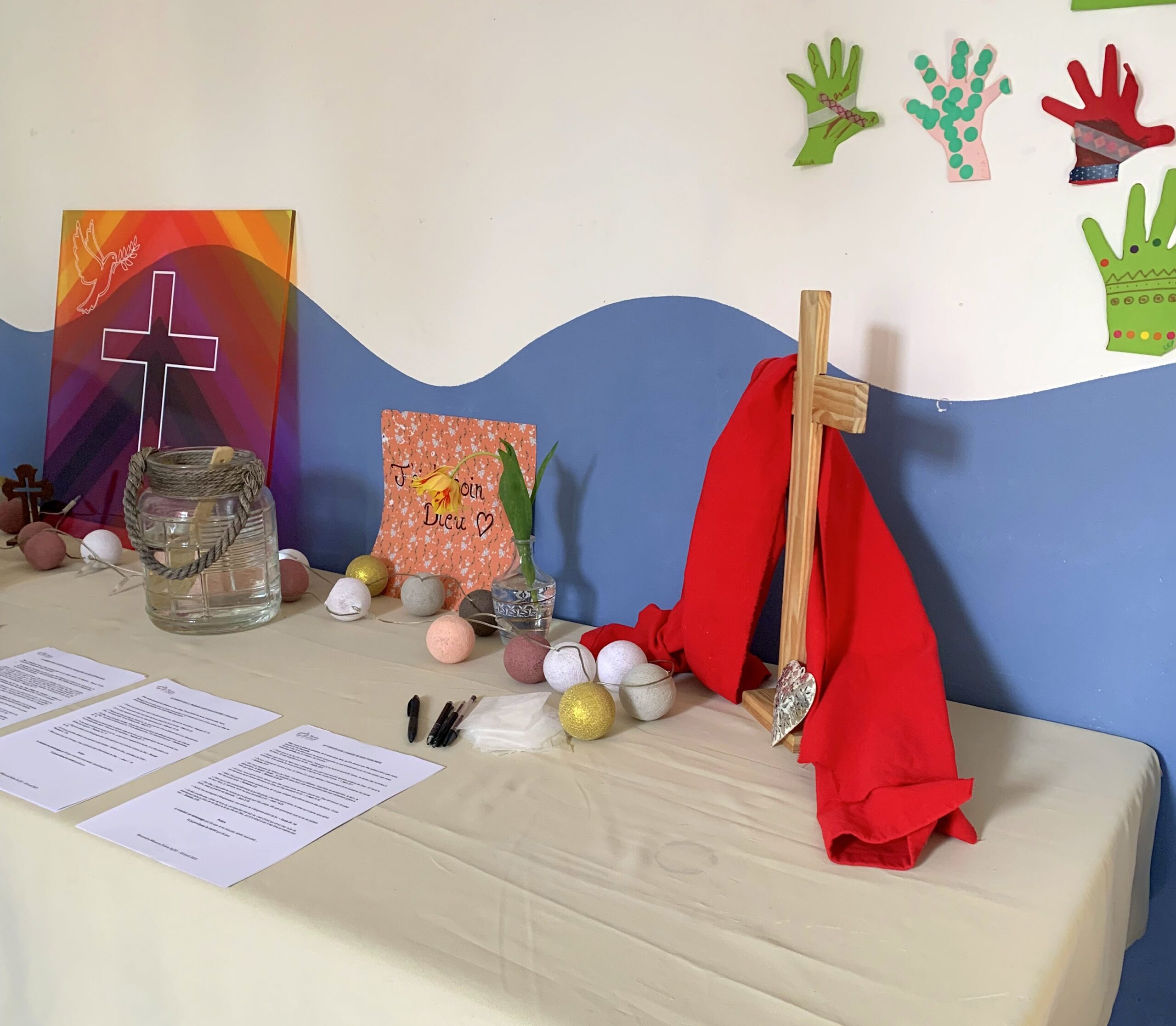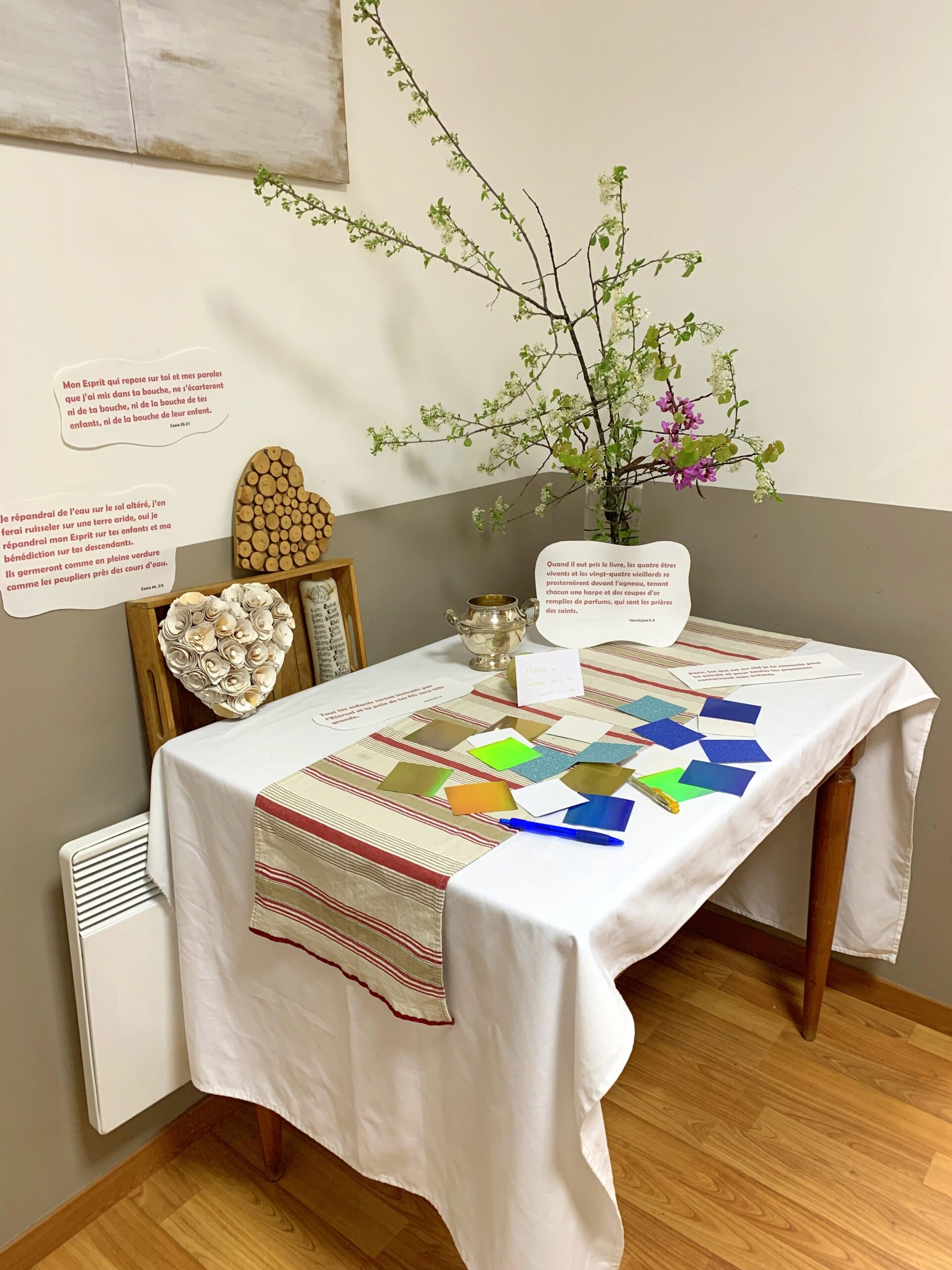 Puis nous nous sommes engagées dans un Parcours Spirituel de louange/adoration, de confession/repentance, de reconnaissance et d’intercession (selon les 4 étapes de la prière MEPI). Quatre stands étaient dressés pour nous conduire dans ces quatre étapes en prière et dans le silence de nos cœurs.