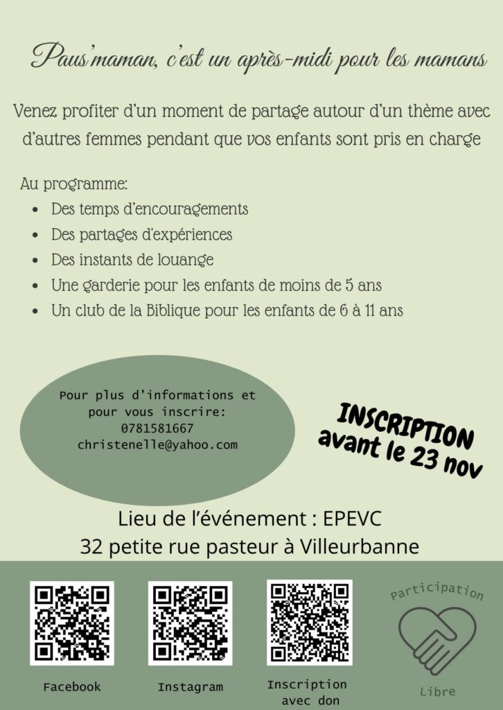 Yaëlle a été invitée pour présenter le sujet « la prière, quelle place dans la vie d’une mère ? » à la rencontre « Paus’maman » à Lyon le samedi 29 novembre.