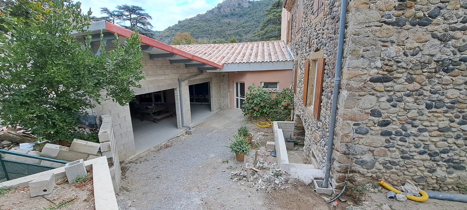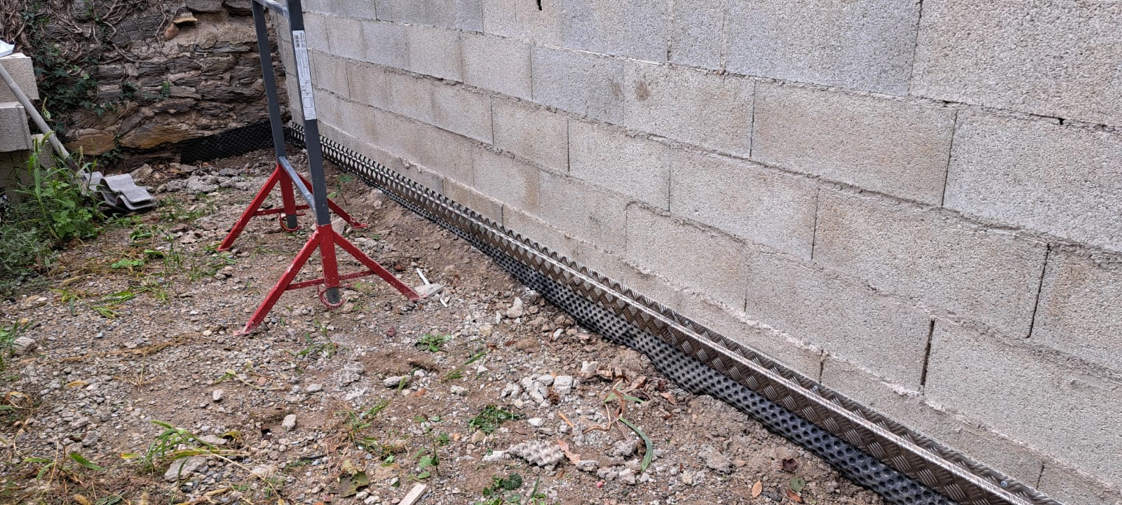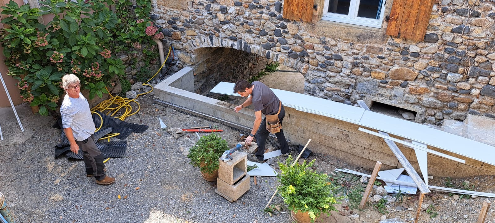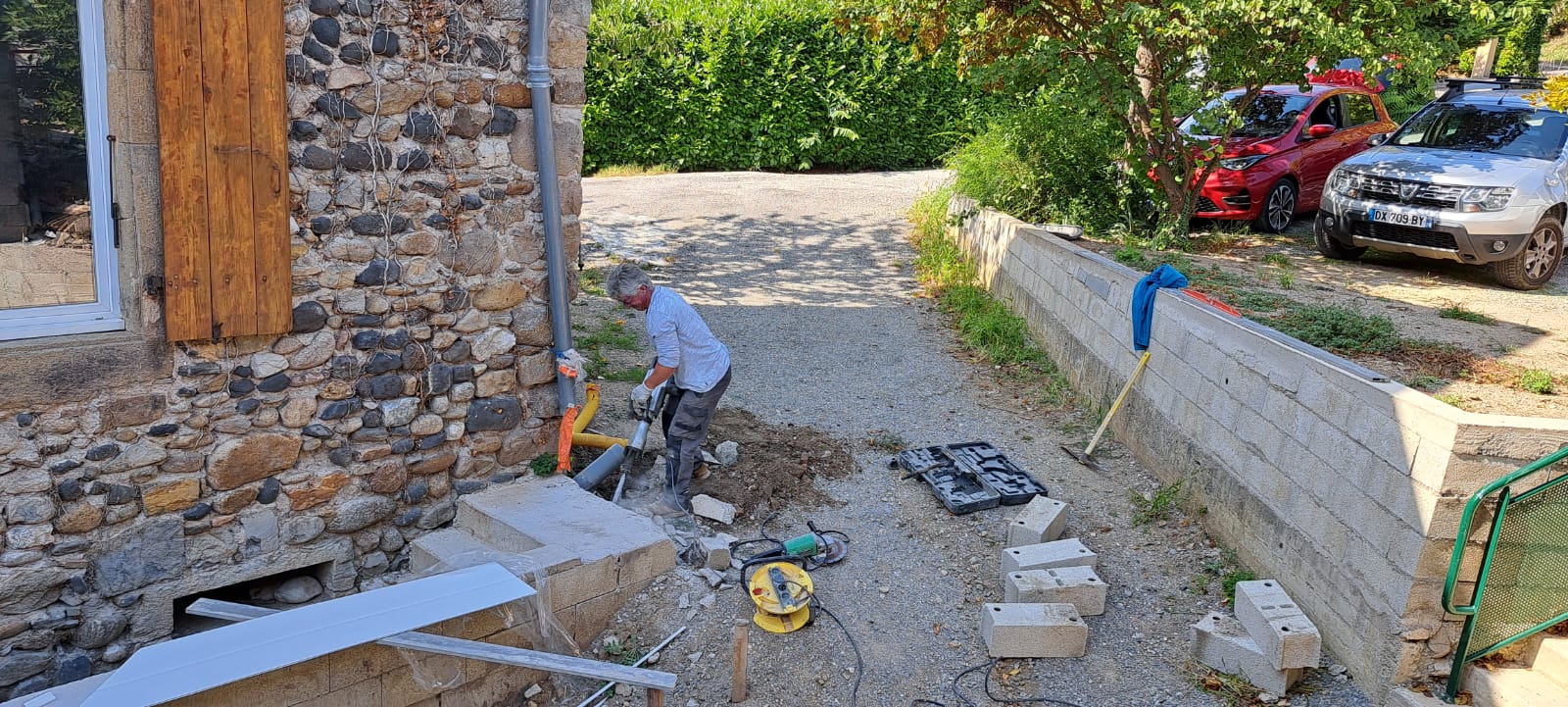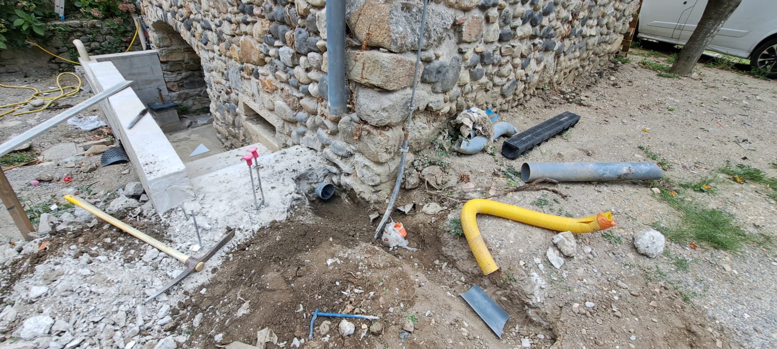 • La dernière marche des escaliers était trop haute. C’est elle qui conditionne la rampe PMR. Elle a donc été supprimée. Et mise en place d’un regard pour la descente d’eau de pluie