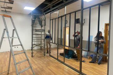 Nous étions nombreux aujourd’hui, du coup nous avons pu faire pleins de choses et finir : le placo, l’isolation du plafond, poser les cornières des sous faces, repositionner les descentes d’eau, etc.